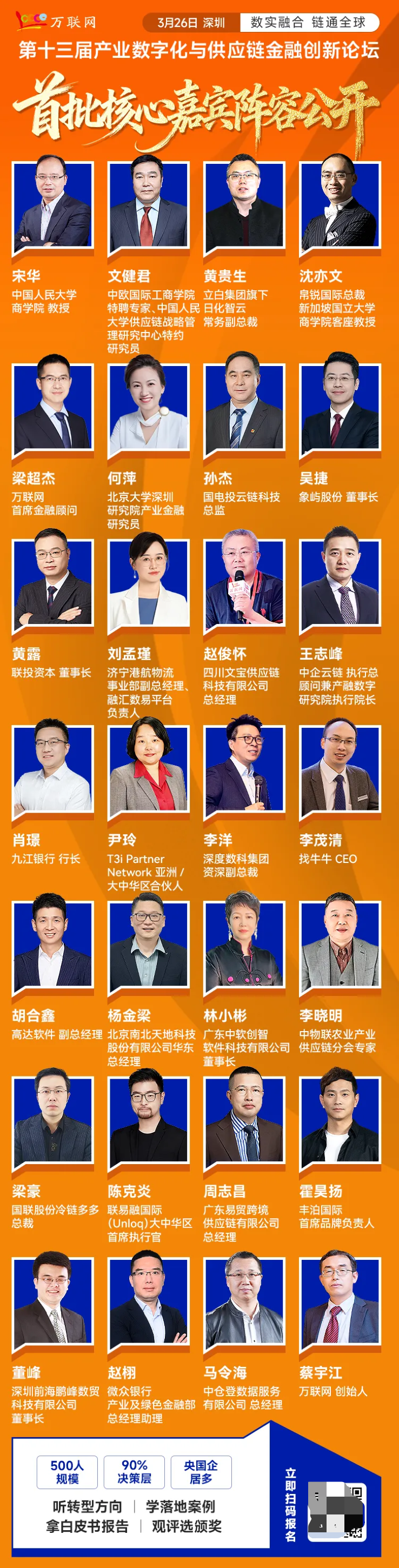 大会以 “数实融合?链通全球” 为主题,汇聚500+央国企/上市公司/行业龙头/供应链公司/物流商/科技服务商/金融机构高管精英,以及30+行业顶尖智慧——中国人民大学商学院教授宋华、中欧国际工商学院特聘专家文健君、新加坡国立大学商学院客座教授沈亦文、北京大学深圳研究院产业金融研究员何萍、万联网首席金融顾问梁超杰、中物联农业产业供应链分会专家李晓明6大顶尖专家学者,以及象屿股份、国电投云链科技、山东融汇集团、湖北联投资本、四川文宝供应链科技、中企云链、深度数科集团、找牛牛、高达软件、南北软件、中软创智、立白集团旗下日化智云、国联股份冷链多多、联易融国际、易贸跨境供应链、丰泊国际、鹏峰数贸科技、中仓登、九江银行、微众银行等行业顶流专家、大咖坐镇分享: